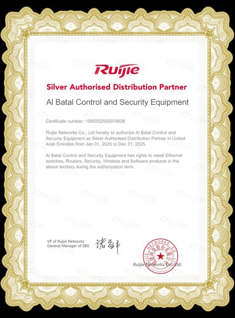 Recognized by Ruijie Networks Co., Ltd. as a Silver Authorized Distribution Partner in the UAE, with full rights to distribute Ethernet switches, routers, wireless, and software products.